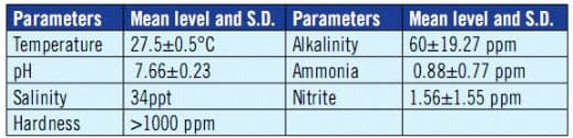Water quality parameters were monitored. Temperature was measured daily. The pH, hardness, ammonia, nitrite and alkalinity were determined daily using a commercial test kit (AQUA-VBC, Thailand). The salinity was measured weekly with a refractometer (Table 1). Water quality parameters appeared to be normal although ammonia did give cause for concern.Table 1. Means of water quality parameters.
