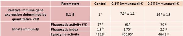 These results show that ImmunoWall® was able to improve the immune gene expression response and innate immunity (P<0.05), and therefore reduce the mortality rate (P<0.05), when the fish were challenged with Lactococcus gravaeie and Aeromonas hydrophila, compared to the control group.