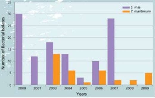 Associated mortality in barramundi may be gradual or acute depending on the nature of the outbreak but often results in cumulative losses of 50-60%. Recent reports indicate that this disease is becoming more severe with devastating losses of nursery fish after stocking in pre-grow out cages (Note that in Graph 2, T. mar is still a concern with isolates collected in 2009).