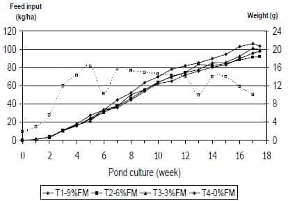 Based on the positive results of the 2004 work with reduced feed inputs and improved production results a similar feeding protocol was employed in the 2005 production season. This study evaluated a fish meal replacement strategy using vegetable protein sources in practical feeds for marine shrimp reared in ponds. Four commercially extruded diets formulated to contain 35% crude protein and 8% lipids were evaluated. These diets included varying levels of fish meal (9, 6, 3, and 0%) which was replaced by a combination of soybean meal (32.48, 34.82, 37.17 and 39.52% respectively) and corn gluten meal (0.00, 1.67, 3.17, and 4.84% respectively) to replace the protein originating from fish meal. In addition, dietary treatments maintained a minimum lysine and methionine plus cystine content of 5% and 3% of the total protein, respectively, and were supplemented with calcium phosphate to ensure adequate phosphorus supply. Feeds were commercially manufactured and offered as a sinkable, extruded 3 mm pellet. Feed inputs during the 1st, 2nd, 3rd and 4th weeks of pond culture were set at 10, 15, 30 and 60 kg of feed/ha/day, respectively (Figure 4). For the remainder of the growth trial, feed inputs were back-calculated, based on an expected weight gain of 1.5 g per week, a feed conversion of 1.2:1, and a total mortality of 30% (1.66%/wk) distributed over an 18-weeks culture period. Feeding during the first 19 days after stocking was done using the a commercial feed Treatment feeds were offered from day 20, when it was estimated that shrimp had reached 1 g of weight. Maximum feed inputs were set at 83.3 kg of feed/ha/day at the 5th week of culture