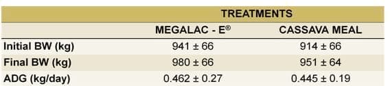 Semen of bulls supplemented with rumen bypass fat had a 11% increase in vigor (3.62 vs 3.26) than semen of bulls supplemented with cassava meal (p=0.07) (Table 3).