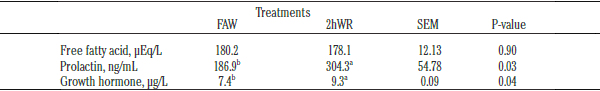 Free fatty acid concentration in plasma was not affected (P>0.05) by treatment groups (Table 4). Prolactin and growth hormone were higher (P<0.05) in 2hWR group than the FAW group (Table 4).