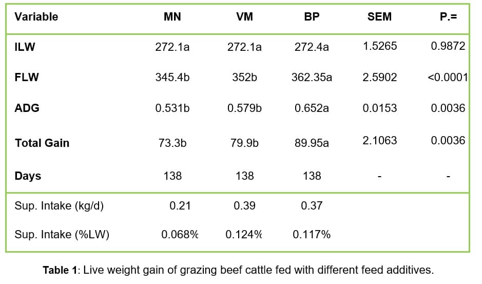 Growth performance of animals was better in Silvafeed® ByPro group, which was 12% more than VM and 22% more than MN. These results demonstrate that ionophores or antibiotic additives can be replaced by this blend of plant bioactives, and it will provide better gains in the rearing of grazing calves with low protein supplements.