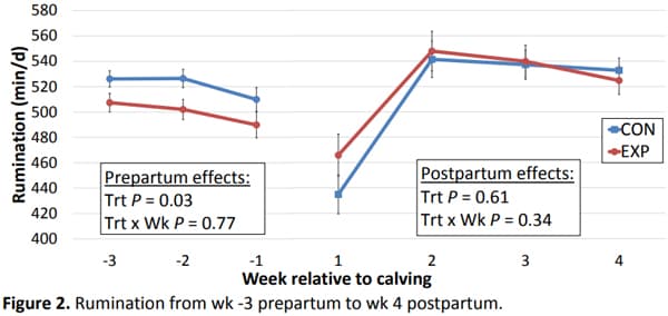 - Cows fed the EXP diet tended to have reduced DMI during the prepartum period but did not differ postpartum. Rumination was significantly lower in EXP fed cows during the prepartum period but was not different postpartum.