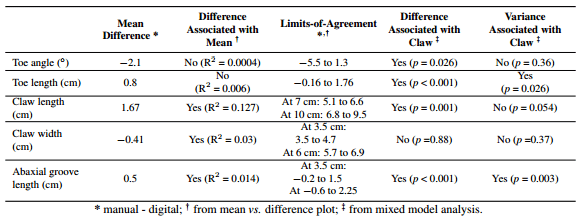 Further research is required to better establish the comparability of all conformation measures so that the agreement between different methods (such as digital vs. manual measurement) can be better compared to the expected variation from repeated measures of the same subject using the same method. Such analyses need to take account of differences between individual claws.