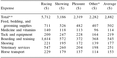 Total spending on horses varies widely between the four categories of horses, the Deloitte study found (Table 3). Horse owners spend an average of nearly $2,900 per year per horse for feed, veterinary care, and other products and services. However, annual spending ranged from a high of $5,712 per horse for the average racing horse to a low of $2,282 for horses in the ‘Other’ category, which includes horses engaged in farm and ranch work, rodeos, police work, sports, and other activities.