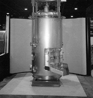 Alltech is interested in production of enzymes in deep layers as well as thin layer tray systems. A pilot scale deep bed fermentation system was constructed (Figure 6). The reactor is a vertical stirred reactor based on a modified lauter tun design. The system is designed to be used at a maximum depth of about 50 cm. The entire unit sits on load cells to measure weight loss during the fermentation. The substrate is sterilized by a rotary mixer that can be pressurized and heated. During the fermentation, temperature, oxygen, carbon dioxide, airflow and relative humidity can be monitored. The reactor will enable studies to determine if organisms can perform in deep layers at pilot scale levels and develop an understanding of heat production.