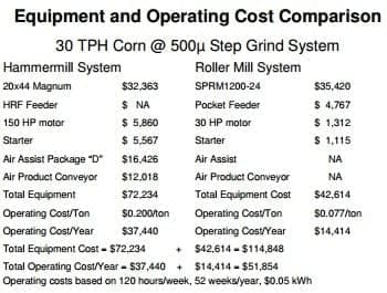 used to reduce the size of corn to a mean particle size of 500µ. To achieve this relatively fine finished product while maintaining a high throughput (30 TPH in this case) both the roller mill and hammermill increase in size and connected HP. Since the roller mill in this example is significantly larger than the two previous scenarios, the cost of the machine increase quite dramatically. In fact, the installed cost of the roller mill will be greater than a hammermill of equal capacity, even taking into account the higher cost of larger motors, starters, and the air assist system needed to maintain peak operating efficiency.
