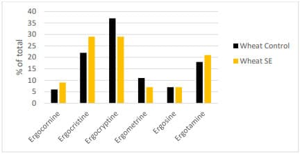 The potential importance of the altered EA profile from hydrothermal treatment of the feed is also highlighted by the work of Coufal-Majewski et al. (2017). Pelleting diets for lambs had no effect on total EA content, but ergotamine and ergosine were 2-3 times greater in mash feeds, while ergocornine, ergocristine and ergometrine were 2-3 times greater in pelleted diets. Lambs fed the pelleted diets had 60 g/d greater ADG than those fed the mash diets. Moreover, the ergot induced depression in serum prolactin was less when the diets were pelleted (Coufal-Majewski et al. 2017.) As mentioned previously, there are numerous suggestions in the literature of a differential role of the “S” and “R” EA epimers, specifically referred to as the “biological inactivity of the ‘S’ epimer”. Moreover, it has been demonstrated that processing affects this ratio. For example, baking cookies with ergot contaminated rye flour resulted in a 2-30% degradation of the EAs, plus a shift to the “S” epimer for all EAs (Merkel et al. 2012) and Tittlemier et al. (2019) reported a higher proportion of the “S” epimers resulting from the milling and cooking during the production of spaghetti.