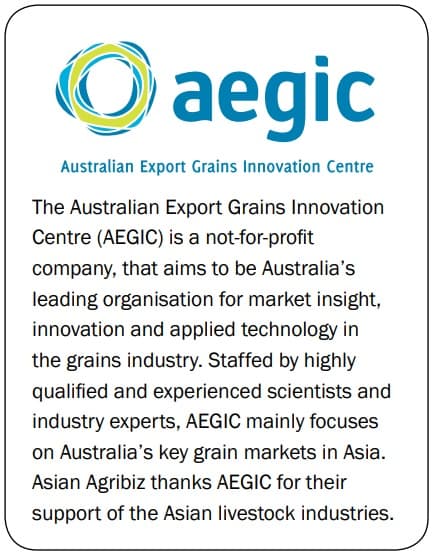 Barley ranks fourth in global cereal production after corn, wheat and rice. About 65% of the world’s barley produced is fed to animals, including poultry. Australia is a significant global producer of barley, ranking in the top 5 countries with about 5% of global production and is among the top 3 barley exporters accounting for about 30% of malt and 20% of feed barley trade. Australia is a reliable supplier of two-row spring barley that is suitable for a wide range of malting, brewing and animal feed applications. Australian barley production averages about 8 million metric tonnes per year, comprised of about 5.5 million tonnes of feed and 2.5 million tonnes of malt grades. Typically, about 1.3 million tonnes of the feed barley is consumed domestically and 4.2 million tonnes exported.