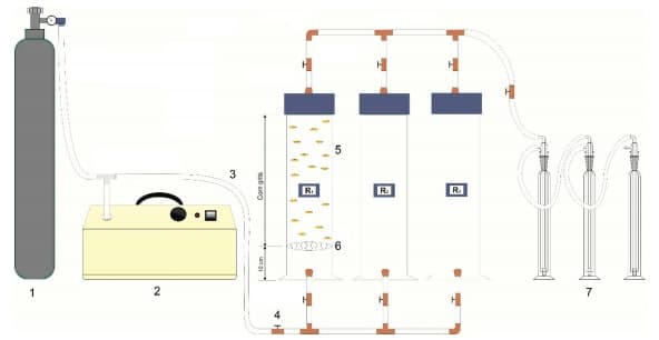 Figure 1. Ozonation system. 1—O2 cylinder/flux control valve; 2—Ozone generator; 3—Silicone hoses; 4—Copper connections; 5—PVC cylinders containing the corn grits; 6—Polyamide silicone support disk; 7--Gas wash bottles with potassium iodide solution.