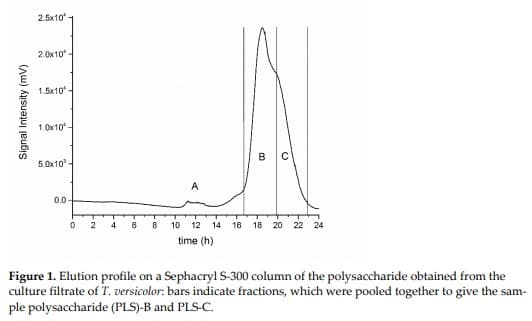 The polysaccharide (PLS) sample obtained from T. versicolor culture filtrate was purified according to the procedure described in the Methods section and subjected to size exclusion chromatography (SEC) to check for its homogeneity. The obtained chromatogram (Figure 1) showed an early eluting low intensity peak (A), which was disregarded, and one main peak (B) accompanied by a shoulder (C): collected test tubes were pooled as reported in Figure 1 to give two PLS fractions which were named PLS-B and PLS-C.