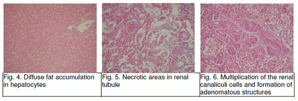 On the 21st day, 10 animals from each group were slaughtered and samples of liver, kidney and intestinal tissue were taken for pathohistological examination.