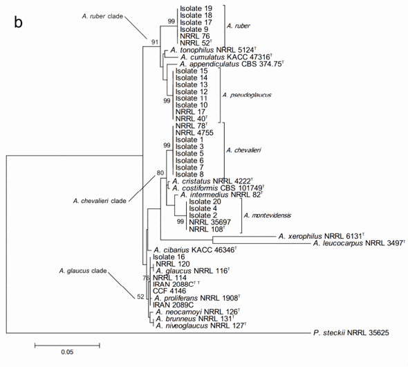The sequences of the 20 studied isolates were in all the cases 100% identical to GenBank type-strain reference sequences. The three characteristic multispecies clades of the section (A. chevalieri, A. glaucus and A. ruber clades) were clearly detectable and all the terminal species clades with studied isolate sequences were strongly supported having bootstrap values higher than 80.