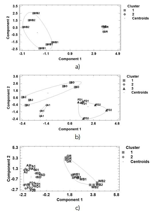 Figure 5. Clusters formed from Colombian coffee samples according to PC1 and PC2. (a) roasted coffee, (b) soluble coffee, (c) roasted and soluble coffee. For sample codes refer to Table 1.
