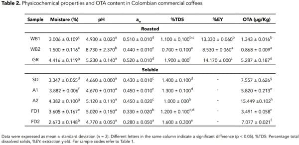 Through the application of the ELISA immunoassay technique, the quantification of OTA in coffee samples from the Colombian market was achieved, obtaining a variable range of OTA, where soluble coffees presented a higher (p < 0.05) OTA contents than roasted coffees and 25 % of the samples exceeded the limits established by the regulations, representing 1.77 and 31.45 % of the IDT of OTA defined by JECFA. The OTA content presented a significant and positive grouping and correlation (p < 0.05) with %EY, %TDS, ASP, porosity, and CBD, confirming the interdependence of these variables, which are associated with the extraction capacity of coffee solutes. In contrast, the other physical properties studied did not show important relationships with the OTA content. The yeast and mold count showed values within the regulations’ limits, showing that the OTA present in the coffee samples comes from stages prior to the coffee production and packaging process.