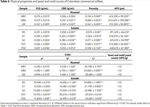 The results obtained from the analysis of physical properties are shown in Table 3. For roasted coffee, FLD and CBD ranged from 0.275 – 0.337 and 0.306 – 0.459 g/mL, respectively. FLD only presented a strong, significant, and positive correlation (p < 0.05) with CBD, while CBD presented a significant and positive correlation (p < 0.05) strong with porosity and b*, and moderate with a*; and strong negative with the APS. In the case of soluble coffee, the FLD and CBD ranged between 0.202 – 0.231 and 0.246 – 0.323 g/mL, respectively, highlighting that the FLD and CBD of soluble coffees were lower (p < 0.05) compared to that of roasted coffees. The FLD only showed a strong, significant, and negative correlation (p < 0.05) with porosity. CBD showed a strong positive and significant correlation (p < 0.05) with porosity and moderate with a*, while it presented a moderate, significant, and negative correlation with L*.