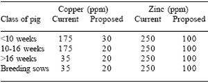 Environmental implicationsCopper and Zn are of particular concern as regards environmental impact, since inorganic sources (Cu sulphate and Zn oxide) are often fed at pharmacological levels that are well above the physiological requirements of the animals in order to promote growth rate and to prevent bacterial diarrhoea. Their excretion contributes to soil and water pollution and may well be toxic to plants and animals. They are also the most likely to be toxic to the microflora in the soil. It is for this reason that the Animal Feed Committee of the European Union has proposed maximum inclusion levels that are well below current authorised levels (Table 3). These values refer to the total content in the feed, including that present in the raw ingredients.