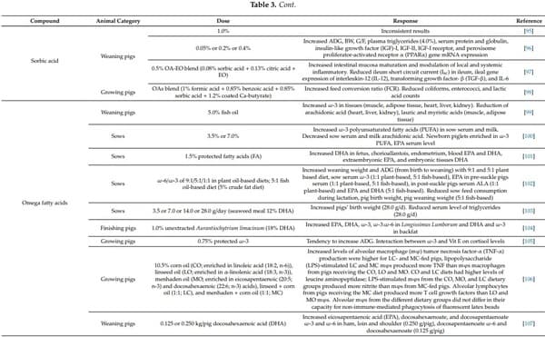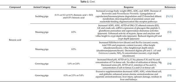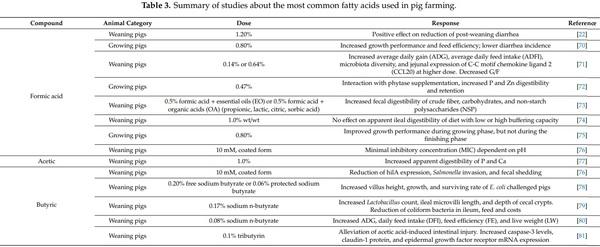 Abstract: Reduction of antibiotic use has been a hot topic of research over the past decades. The European ban on growth-promoter use has increased the use of feed additivities that can enhance animal growth performance and health status, particularly during critical and stressful phases of life. Pig farming is characterized by several stressful periods, such as the weaning phase, and studies have suggested that the proper use of feed additives during stress could prevent disease and enhance performance through modulation of the gastrointestinal tract mucosa and microbiome. The types of feed additive include acids, minerals, prebiotics, probiotics, yeast, nucleotides, and phytoproducts. This review focuses on commonly used acids, classified as inorganic, organic, and fatty acids, and their beneficial and potential effects, which are widely reported in the bibliography. Acids have long been used as feed acidifiers and preservatives, and were more recently introduced into feed formulated for young pigs with the goal of stabilizing the stomach pH to offset their reduced digestive capacity. In addition, some organic acids represent intermediary products of the tricarboxylic acid cycle (TCA), and thus could be considered an energy source. Moreover, antimicrobial properties have been exploited to modulate microbiota populations and reduce pathogenic bacteria. Given these potential benefits, organic acids are no longer seen as simple acidifiers, but rather as growth promoters and potential antibiotic substitutes owing to their beneficial action on the gastrointestinal tract (GIT).
