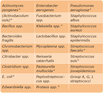 When the urinary tract, which is usually sterile, is colonized by bacteria it results in an infection which is most often sub-clinical. A variety of endogenous and opportunistic microbes such as E. coli, Streptococcus sp.,Staphylococcus epidermidis, Klebsiella sp.,Pseudomonas sp.,Aeromonas sp.,Bacteroides sp. are natural inhabitants of the lower urinary tract and are able to cause non specific UTI. However, they may open the door to invasion by Actinobaculum suis, which is gram-positive, fimbriated etiologic agent of specific UTI. UTI includes cystitis (inflammation of urinary bladder) and pyelonephritis (inflammation of kidneys). The microbiological ecosystem of urinary tract of sows changes spontaneously during production events but the largest changes are caused by antimicrobial treatments.