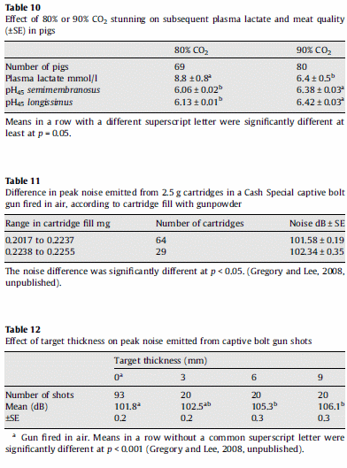 Many pig abattoirs that have adopted CO2 stunning, use 90% CO2. The minimum concentration that is usually recommended is 80 %, and this was based on work originally conducted in Germany.  More recent work from Germany has indicated that 90% causes less physical stress than 80%, as it results in a less pronounced metabolic acidosis, but 90% can cause behavioural aversion (Nowak, Mueffling, & Hartung, 2007; Table 10; Velarde et al., 2007). Five gas stunning systems have been developed for broilers, and two of them are gaining popularity (Gregory, 2005). They are the UK method which uses 60% argon plus 30% CO2, and the Dutch method which uses 40% CO2 plus 30% O2 followed by 80% CO2 plus 5% O2. Recent work confirmed practical experience that the Dutch method results in less convulsions, fewer fractured wings and less breast meat haemorrhages (McKeegan et al., 2007). It also showed that there was slightly tougher meat during the initial stages postmortem with the Dutch method, but this effect disappeared with aging.