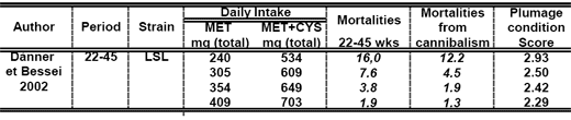 An experiment, by Harms and Russel (1996), shows that birds respond at an increase in the Cystine level and also to a higher level in Methionine (table7). This experiment shows clearly a requirement for Cystine and also for Methionine. However the egg mass produced by the birds in this experiment was quite low.