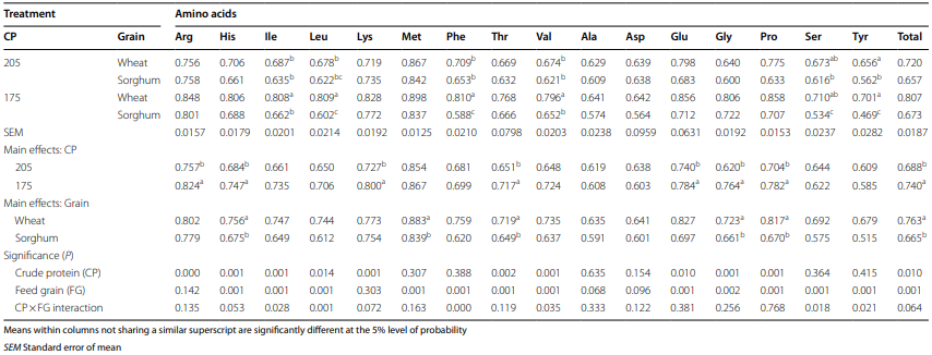 One treatment interaction (P=0.037) was observed in the distal ileum which was for phenylalanine because wheat supported significantly higher digestibility than sorghum by 13.6% (0.879 versus 0.774) following the transition to 175 g/kg CP diets. As main effects, the CP reduction diets supported significantly higher digestibilities of alanine (10.2%), aspartic acid (9.50%), serine (7.17%) and tyrosine (8.79%) than sorghum-based diets. Again, as main effects, wheat-based diets generated significantly higher digestibilities of histidine (6.44%), isoleucine (5.78%), leucine (8.58%), valine (6.02%), glutamic acid (8.25%), proline (11.3%), serine (6.63%), tyrosine (10.5%) and total amino acids (6.01%) than sorghum-based diets.