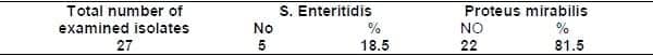 Table (3): Results of serotyping of Salmonella spp. indicating that only 5 isolates are S. Enteritidis.