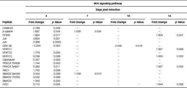 The KEGG pathway results generated from STRING showed a large number of pathways implicated by the data at a statistically significant level [p < 0.05 false discovery rate (FDR) corrected]. Of particular interest were those pathways that showed a large number of statistically significant peptides that were phosphorylated at different times over the course of the study. These pathways are shown in Table 4. Of note are the Wnt signaling and TGF-β4 signaling pathways that were dramatically altered by the infection. Both of the pathways had multiple significantly altered peptide phosphorylation events at multiple time points post-infection; however, a total of 20 differentially phosphorylated peptides were found within these two pathways in chickens on the fourth day post-infection with S. Enteritidis (Table 4), signifying a dramatic local post-translational modification of the infected cecum. Of the 20 peptides that were differentially phosphorylated, 13 belong to the Wnt signaling pathway and 7 to the TGF-â4 pathway. Interestingly, only nine more total peptides were found to be differentially phosphorylated within these two specific pathways over days 7–14 post-infection (Table 4).