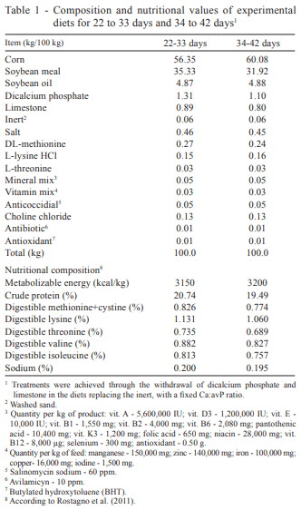 The experimental unit was represented by the cage. The basal diet, composed of corn and soybean meal, was formulated to meet the nutritional requirement of the birds, according to recommendations of Rostagno et al. (2011), except for available phosphorus and calcium. The treatments were obtained by removing the dicalcium phosphate and limestone from the diets in substitution of the inert, keeping the Ca:avP ratio fixed. Water and the diets were available ad libitum to the animals during the entire experimental period. The diet supplied, waste, and orts were weighed periodically throughout the experiment, and the values were utilized for the calculation of feed intake (FI). To determine weight gain (WG), the birds were weighed at the beginning (22 days) and end of the experiment (42 days of age). Feed:gain was calculated based on the data of feed intake and weight gain.