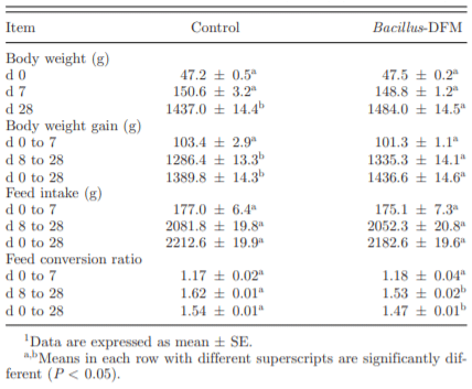 Table 2. Evaluation of body weight, body weight gain, feed intake, and feed conversion ratio in broiler chickens consuming a corn-DDGS-soybean grower diet with or without dietary inclusion of a Bacillus-direct-fed microbial (DFM) (Experiment 1).1