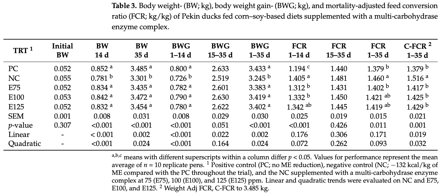 Available information on duck nutrition related to the incorporation of multi-carbohydrase exogenous enzymes in commercial duck diets is scarce [3]; therefore, there is a need to better understand the potential of dietary enzymes to improve duck performance.