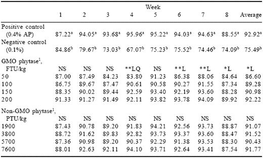 Table 2. Effect of GMO and non-GMO phytases added at recommended or half the recommended dosage on egg production (%) in low phosphorus diets (Experiment 1).