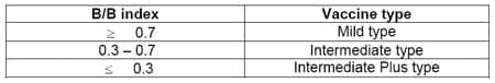 The B/B Index is the ratio between the weight of the Bursa and the body weight of vaccinated birds divided by the same ratio of non-vaccinated birds. The following table shows the B/B index of IBD vaccines.
