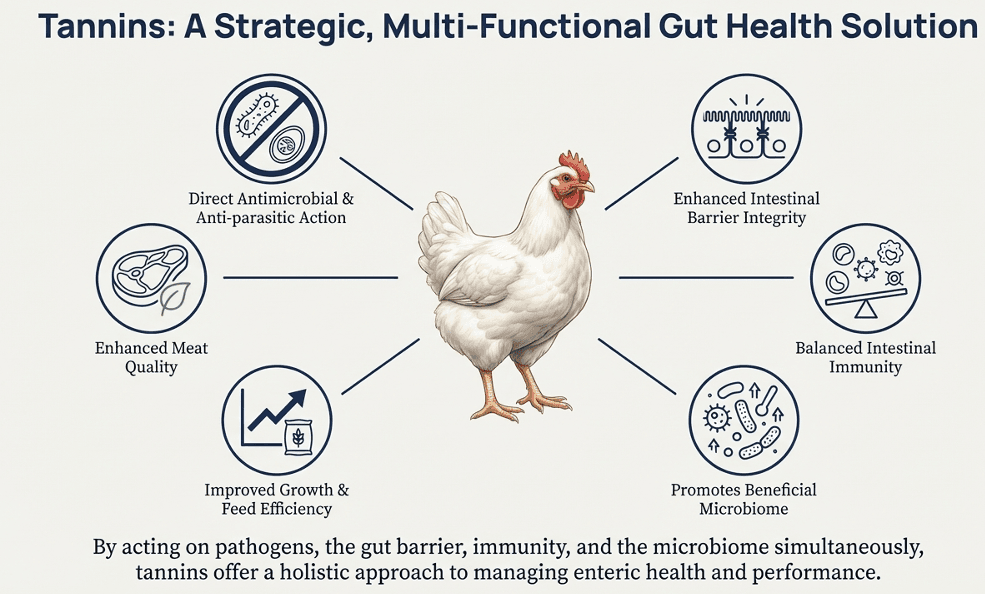 The poultry industry’s shift toward antibiotic-free production has increased interest in functional bioactives that support gut health and performance. Cashew Nut Testa (CNT) tannin, a condensed tannin rich in catechins and procyanidins, demonstrates multiple gut-modulating effects when applied within an optimal inclusion range. Mechanistic studies indicate that CNT tannins inhibit Clostridium perfringens and coccidial development, strengthen intestinal barrier integrity, and modulate mucosal...