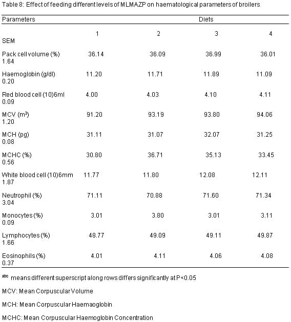 The haematological parameters as influenced by the diets are presented on Table 8. The pack cell volume (PCV) values obtained are 36.14%, 36.09%, 36.99% and 36.01% for diets 1, 2, 3 and 4 respectively while those of heamoglobin (Hb) are 11.20, 11.71, 11.89 and 11.09 (g/dl) for diets 1, 2, 3 and 4 respectively. The Red blood cell (RBC) values obtained are 4.00, 4.03, 4.10 and 4.11 (106ml) for diets 1, 2, 3 and 4 respectively. The PCV, Hb and RBC values slightly increased from diet 1 to 4 but were not significantly (P>0.05) affected by the dietary inclusion of MLMAZP. Mean corpuscular volume (MCV) values obtained are 91.20, 93.19, 93.80 and 94.06 (m3) for diets 1, 2, 3 and 4 respectively while those of Mean corpuscular haemoglobin (MCH) are 31.11, 31.07, 32.07 and 31.25 (pg) for diets 1, 2, 3 and 4 respectively. Mean corpuscular haemoglobin concentration (MCHC) values obtained are 30.80%, 36.71%, 35.13% and 33.45% for diets 1, 2, 3 and 4 respectively. MCV, MCH and MCHC values were not significantly (P>0.05) influenced by the different inclusion of MLMAZP.