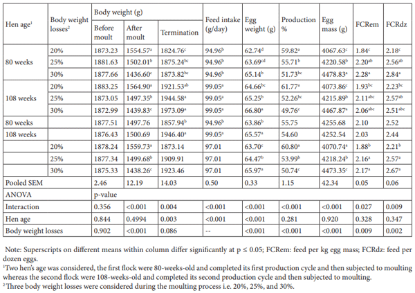 Table 2. Effects of hen age and body weight losses during moulting on productive performance of commercial layer (12 weeks).
