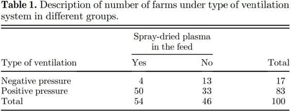 The study was conducted in a broiler integrator company in the State of S~ao Paulo, Brazil. A total of 100 farms were used including 1,101,100 broilers housed under commercial conditions; thus, each farm was considered an epidemiological unit. The experiment followed a 2 x 2 factorial design (Table 1), considering starter diets with or without 1% SDP and 2 different house ventilation systems described as negative pressure (NP) and positive pressure (PP). The NP ventilation system used herein creates a partial vacuum and pulls air into the house evenly through all inlets, improving temperature uniformity within the barn. This system operates through fans and temperature sensors, while the barn walls have plastic canvas closed all the time. The PP ventilation system is composed of sidewalls and ridge vents that allow external conditions to control the inner environment. Fans are installed to regulate the internal temperature of the barn and air renewal to adjust the humidity, while the barn walls have plastic canvas opened by morning and closed by night depending on the weather and desired barn temperature.