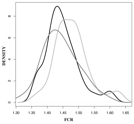 Figure 1. Distribution of FCR values given as a probability density function across the three trials. Trial 1 grey, trial 2 black, and trial 3 light grey. doi:10.1371/journal.pone.0084290.g001