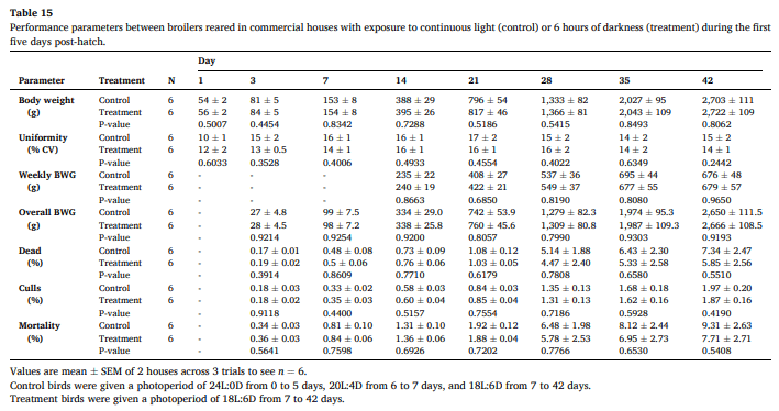 A higher sample size (houses/treatment) would improve the evaluation of early dark periods in commercial settings. A systematic approach should be used where an entire complex is used to compare continuous light versus dark periods during brooding. The combination of a larger sample size and the grower’s varying management styles may show significant effects in performance when utilizing dark periods during brooding.