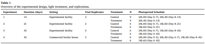 Experiment two followed the same procedures as Experiment 1 with the following exceptions. A 21-day trial was conducted to evaluate the effects of 24 L versus 18 L from day 0-7. Each pen contained 23 chicks, resulting in an initial stocking density of 0.08 m²/bird and a final density of 0.11 m²/bird. The control group maintained a 24L:0D schedule from placement to Day 7, transitioning to 18L:6D from Day 8 to Day 21, while the treatment group received 18L:6D throughout. Birds were individually weighed on Days 0, 7, 14, and 21, with pen weights recorded on Days 3 and 10.