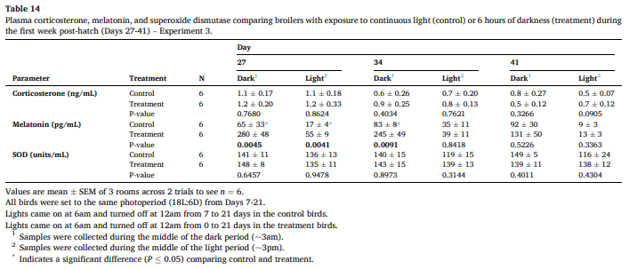 Blood plasma characteristics No differences were observed in corticosterone levels and consistently fell within normal physiological ranges (Table 13–14). Similar trends in melatonin were observed in Experiment 3 as in Experiments 1 and 2. During the dark periods treatment birds exhibited significantly (P ≤ 0.05) higher plasma melatonin levels on Days 6 (468 vs. 192pg/mL), 13 (346 vs. 120pg/mL), 20 (300 vs. 89pg/mL), 27 (280 vs. 65pg/mL), and 35 (245 vs. 83pg/mL) (Table 13). During the light periods, treatment birds exhibited significantly higher plasma melatonin levels on Days 6 (73 vs. 24pg/mL), 13 (109 vs. 30pg/mL), 20 (68 vs. 16pg/mL) and 27 (55 vs. 17pg/mL). These treatment differences were no longer in the light period of Day 35 and the light/dark periods of Day 42. The findings from this research are similar to Ozkan ¨ et al. (2006), who reported similar melatonin concentrations on Day 49 to this research in broilers reared under different lighting schedules (24 L vs. 16L:8D) from Day 2 to 49.
