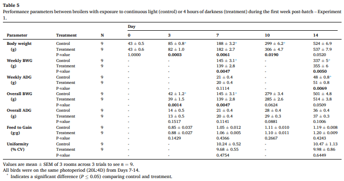It is a common theory among poultry producers that Day 7 weights are correlated with the final flock performance (Aviagen, 2018; Cobb, 2021). The current research suggests Day 7 body weights are relative to the lighting program, and it may not be applicable to compare broiler performance under different lighting programs at Day 7. Day 14 performance may better indicate broiler performance when comparing lighting programs. The current research also suggests that early dark periods do not affect performance; rather, they modify the bird’s growth curve, ending with similar final body weights as birds reared under constant light.