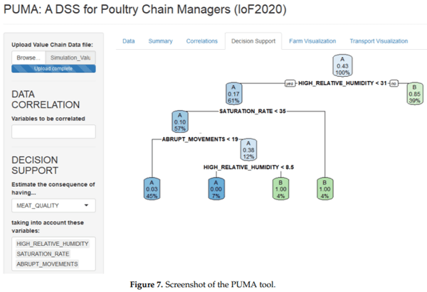 PUMA leverages rules generated from decision trees derived from historical KPIs. As more poultry production chains are observed and the corresponding KPIs are calculated, decision trees and the derived rules are updated. The more the poultry production chains that are observed, the bigger the reliability of the generated rules. These rules capture the real behavior of the breeding carried out on that farm, their respective loads of the animals in the trucks, transport to the slaughterhouses, and their physical status on arrival as well as the final meat quality.