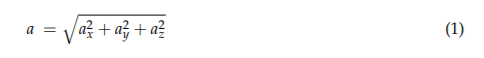 Let a be the acceleration module vector of length t, which is calculated with Equation (1), where ax, ay and az are the acceleration components measured in g along the X, Y, Z axes.