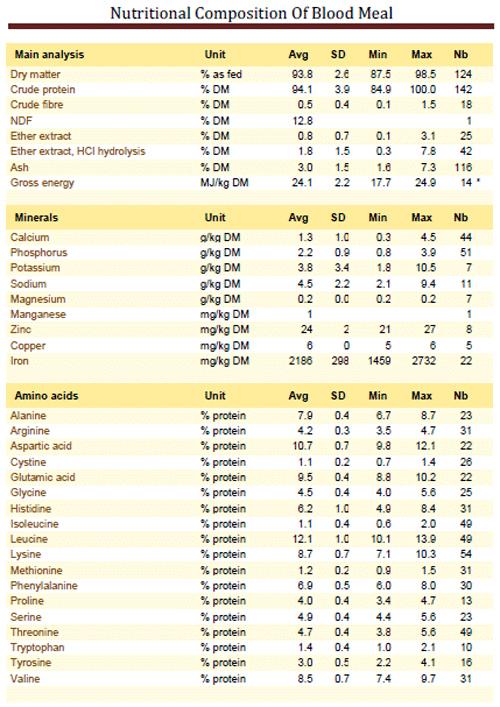 Blood meal contains mostly protein (about 90-95 % DM) and small amounts of fat (less than 1% DM) and ash (less than 5% DM), though non-industrial blood meals may include other materials and thus be richer in ash. Unlike other animal protein sources, blood meal has a poor amino acid balance. Its lysine content is relatively high (7-10 % DM) which makes it an excellent supplementary protein to use with plant-derived feed ingredients that are low in lysine. However, its isoleucine content is very low (about 1 % DM), so diets for monogastric animals must be formulated to contain enough isoleucine for the level of performance desired (Piepenbrink et al., 1998 ; Maiga et al., 1996). Pepsin digestibility has been shown to be a good test for assessing the availability of the protein fraction of blood meal (Hegedüs et al., 1989). Blood meal is rich in iron (more than 1500 mg/kg DM).