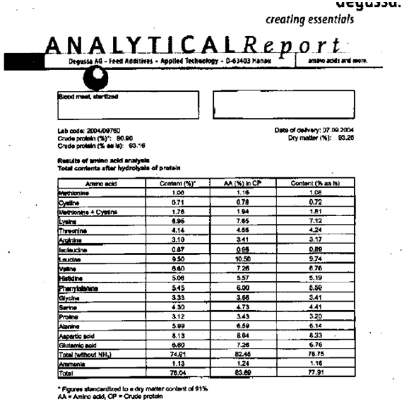 The ring-dried and spray dried blood meal has a greater content of total and available amino acids and is of better nutritional quality. For example, the availability of lysine as a percentage of the total lysine is 84% to 89% for ring-dried blood meal, as compared to batch-dried meal in which lysine is 62% to 77% available.