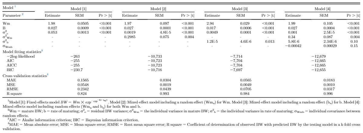 BW measurements were fit to the fixed-effects model [1] and random-effects models [2, 3 and 4] using the NLMIXED procedure in SAS (Version 9.4, SAS Institute Inc., Cary, NC, 2012). The NLMIXED procedure was used to fit the energy partitioning model (equation [5]) as well. The energy initial values of covariance parameters for running PROC NLMIXED were obtained from covariance matrix of individual parameter estimates. Under normality assumptions, minimized value of −2 log-likelihood and the Akaike information criterion (AIC), Bayesian information criterion (BIC), and corrected version of AIC (AICC), provided by the software, were used for the evaluation of alternative models in terms of their fitting performance (Akaike, 1974; Schwartz,1978). The criteria were computed as follows: