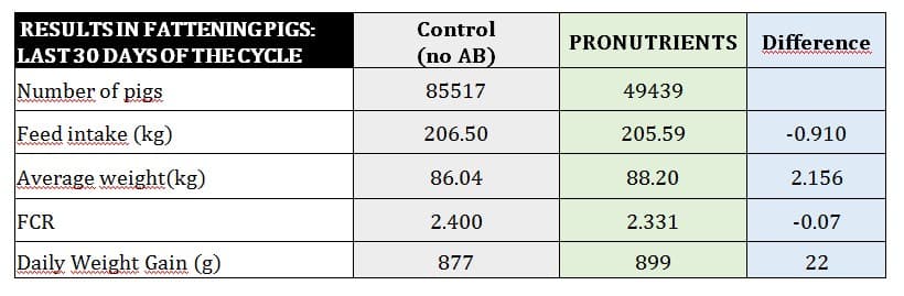 Another critical stage in pig production is the end of the fattening stage, during the withdrawal period of antibiotics. In this case, the use of pronutrients (Table 4), which can be used continuously without withdrawal period, allowed to reduce the FCR, which is of great importance at the moment where the feed intake is the highest.
