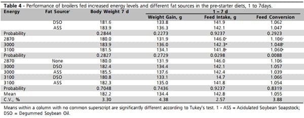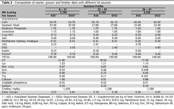 Lighting was continuous in the first week and 18 hours afterwards. Chicks were fed pre-starter diet up to 7 days, starter to 21 d, grower to 35 d and finisher diet to 42 d. All diets were formulated according to NRC (1994) recommendations (Table 2). Pre-starter diets were formulated without fat supplementation (2,870 kcal ME/kg) or added with either DSO or ASS to reach 3,000 or 3,100 kcal ME/kg. Therefore, there were 5 prestarter experimental feeds (treatments) with 8 replicates of 40 chicks each. Energy levels for DSO and ASS were considered to be 8,351 and 7,701 kcal ME/ kg, as previously determined by Machado et al. (2003) in 7-day-old chicks (Table 1).